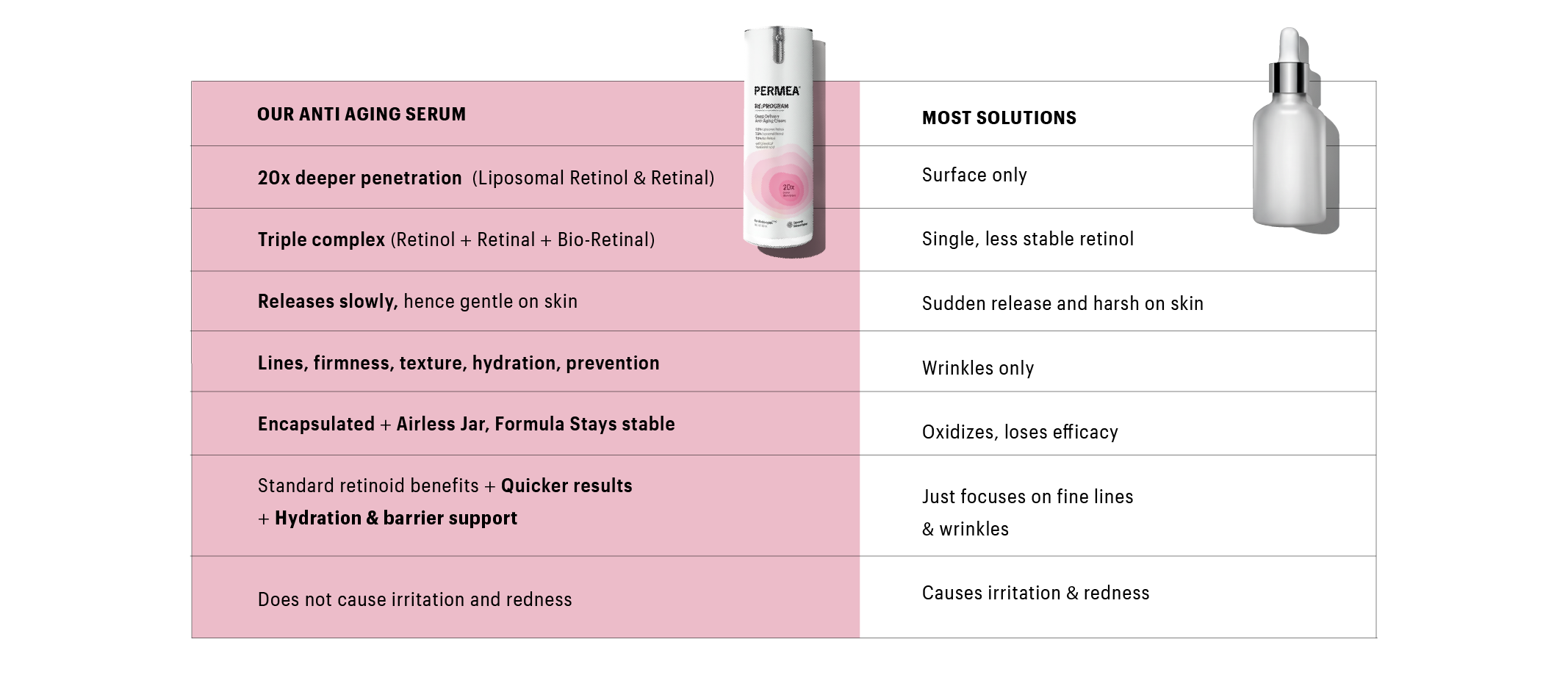 Our complex combines Liposomal Retinol, Liposomal Retinal, and Bio-Retinol, each working in a distinct way—one boosts collagen quickly, another releases slowly for sustained renewal, and third strengthens the barrier.